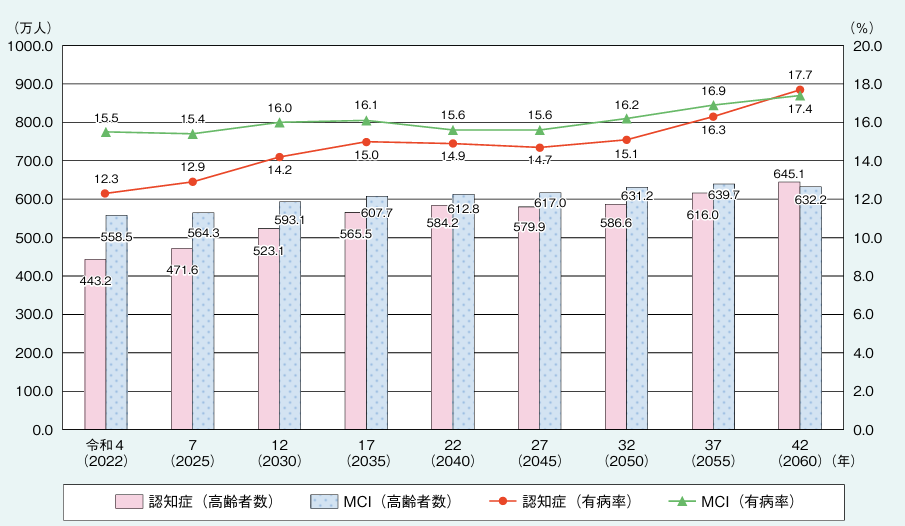 厚生労働省の資料1によると、2040年には認知症患者と軽度認知障害(MCI)患者数の合計が約1,200万人なると予想されています。認知症は、誰の親にも起こりうる身近な問題です。